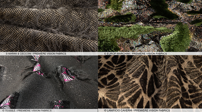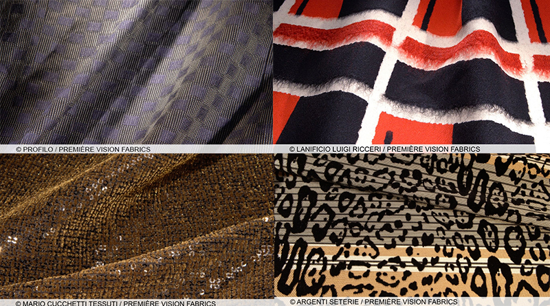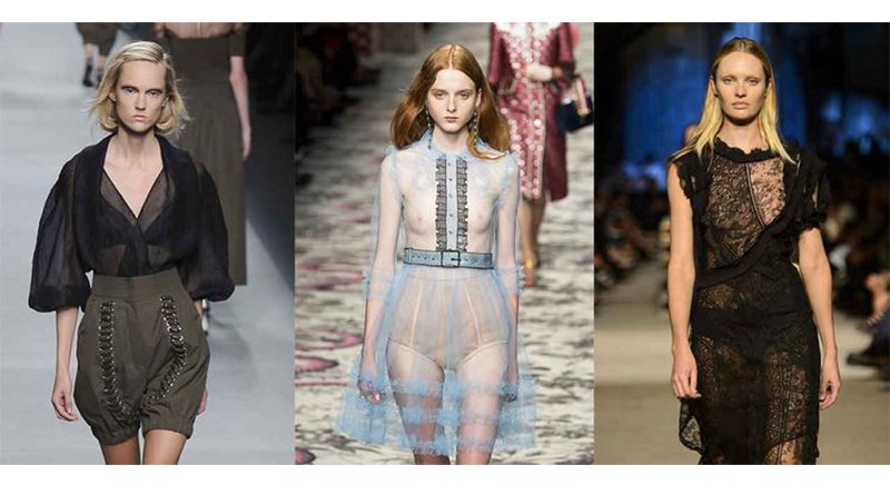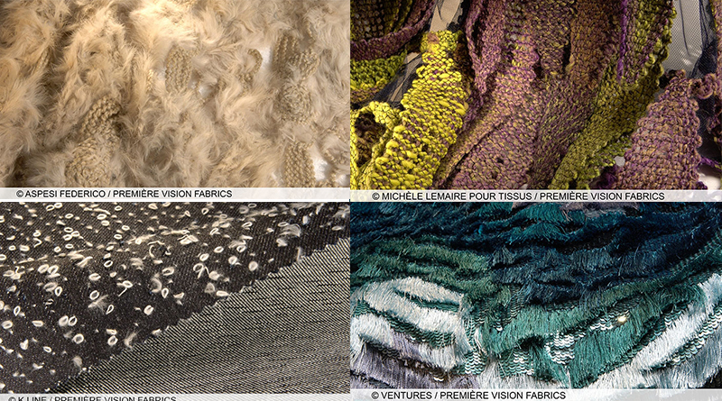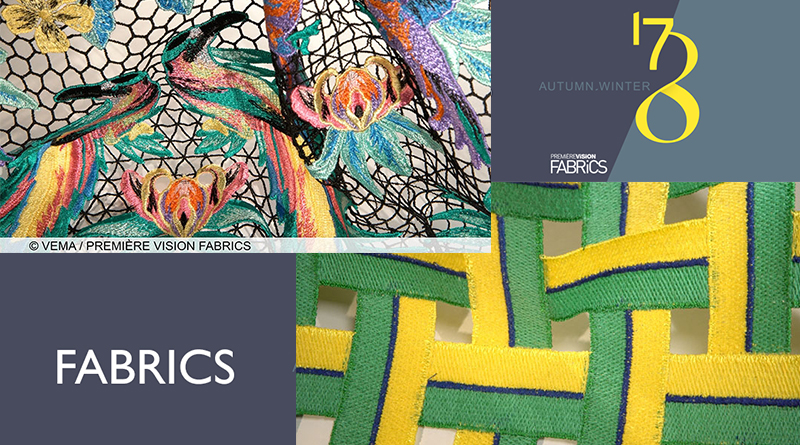 Множество тканей, предлагаемых на сезон осень-зима 2017-18 это ткани  с сетчатыми переплетениями —  сетки с мелкими и крупными ячейками, тонкие и объемные, дублированные трикотажем, и ткани с принтом «под сетку»,  и все, что с этим связано. Благодаря использованию таких переплетений и поверхностей ткани выглядят очень «технично».