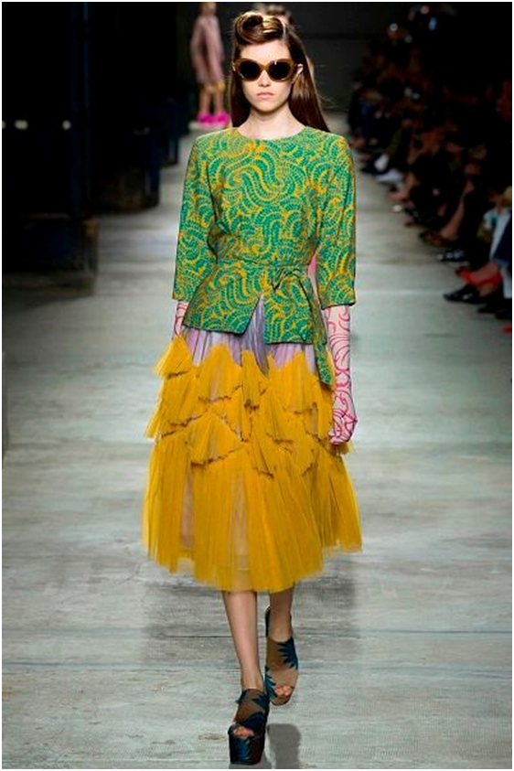 Длина миди — абсолютный хит текущего сезона, поэтому не удивительно, что многие дизайнеры отдали ей предпочтение. Так, дизайнер Dries Van Noten представил юбку-пачку в своих любимых контрастных цветах, а дизайнеры Undercover создали модель, которую можно носить поверх брюк, что тоже очень модно!