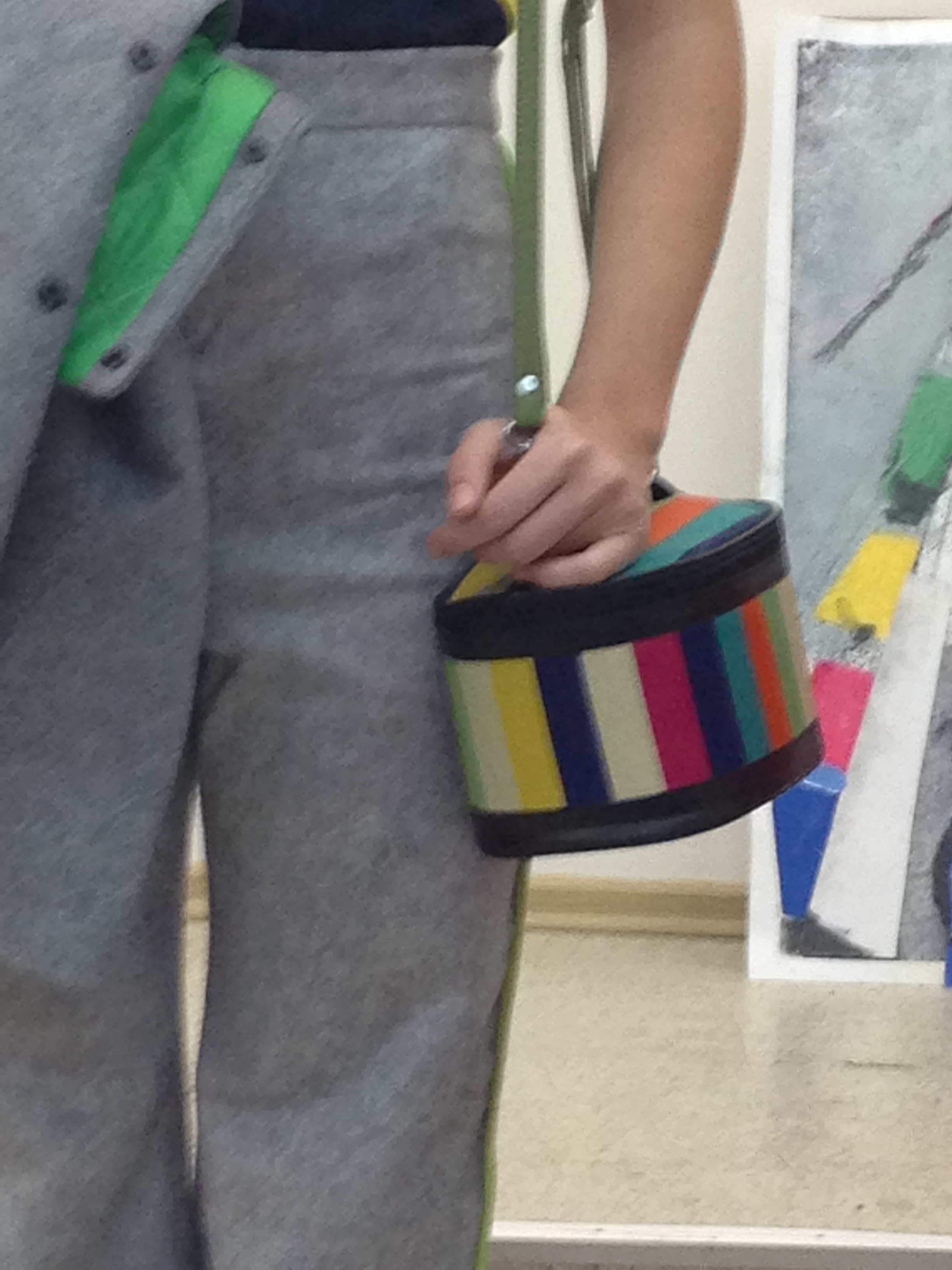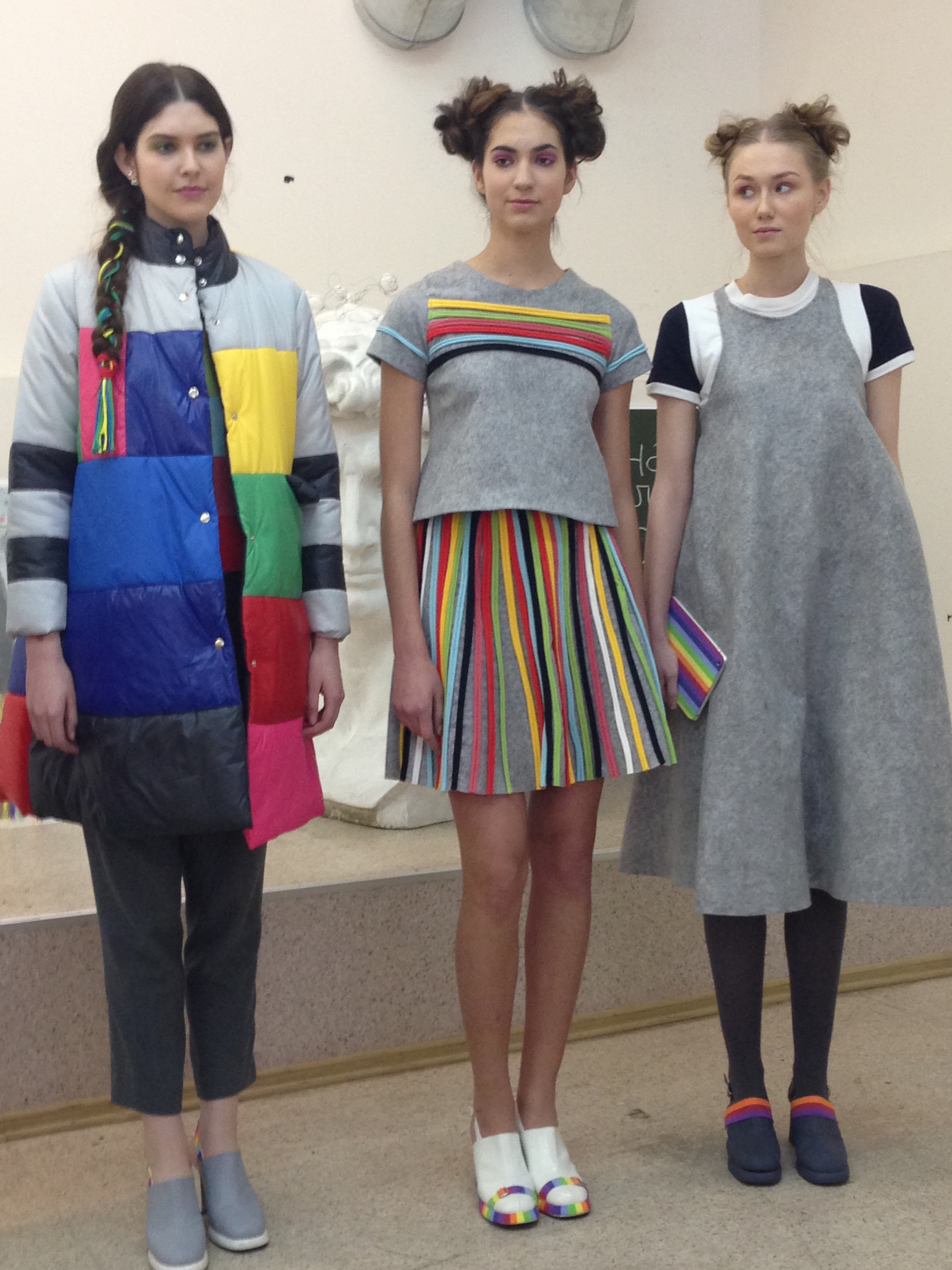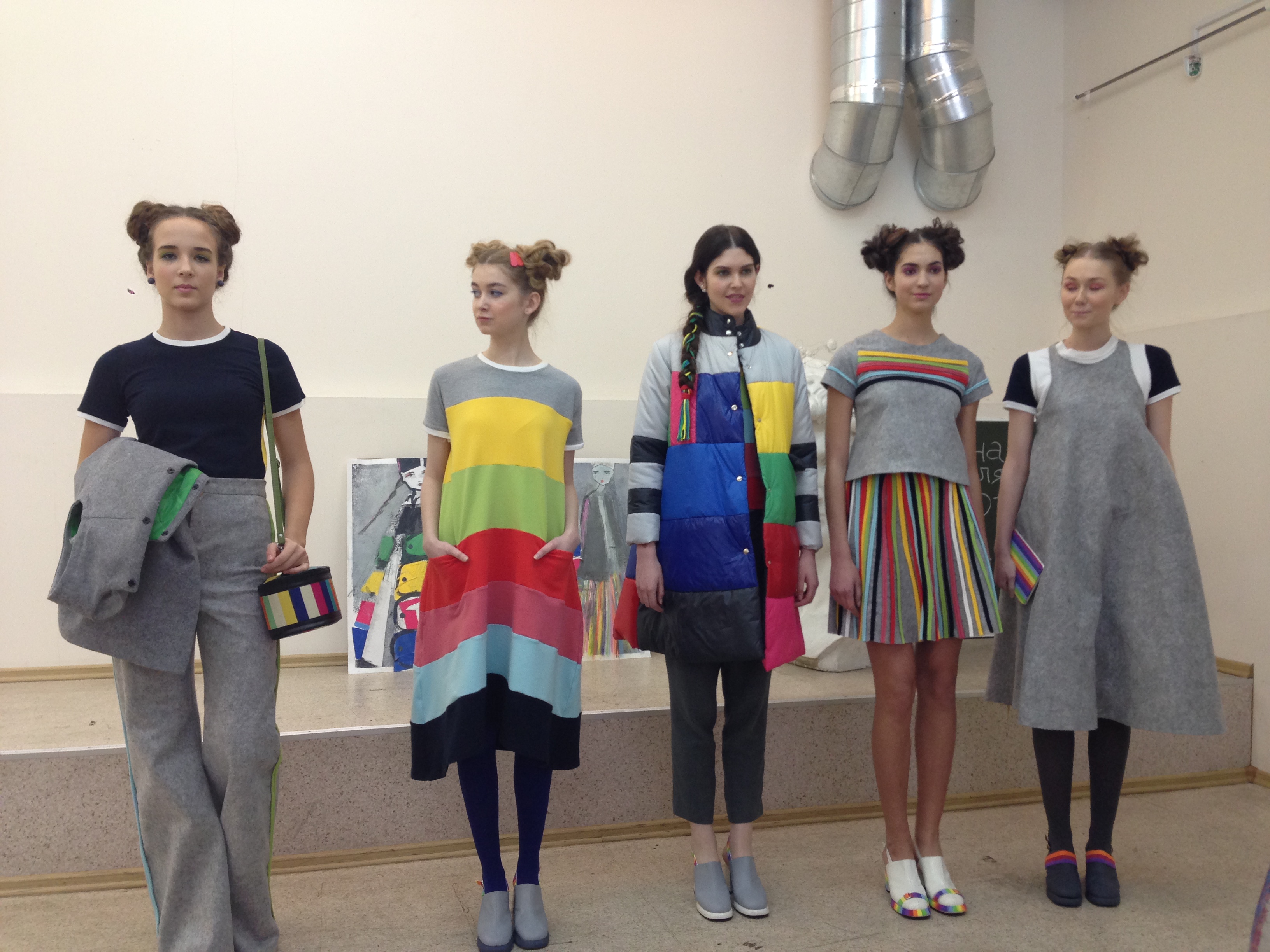Завершила защиту дипломов коллекция Кириловой Саши – яркая, цветная и радостная, как и сама Саша. На каждой модели, словно радугой разбросаны полоски разной ширины, которые создают ритм и графику. А если внимательно присмотреться к аксессуарам – сумочке, украшениям, босоножкам, то в каждом элементе мы найдем эту радугу, что еще раз доказывает то, что каждая деталь коллекции очень важна.